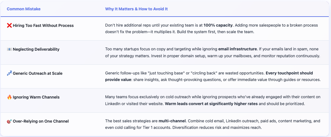 - Scaling beyond your network: You can't rely on warm intros anymore. You need systematic outbound and inbound strategies that generate pipeline predictably.